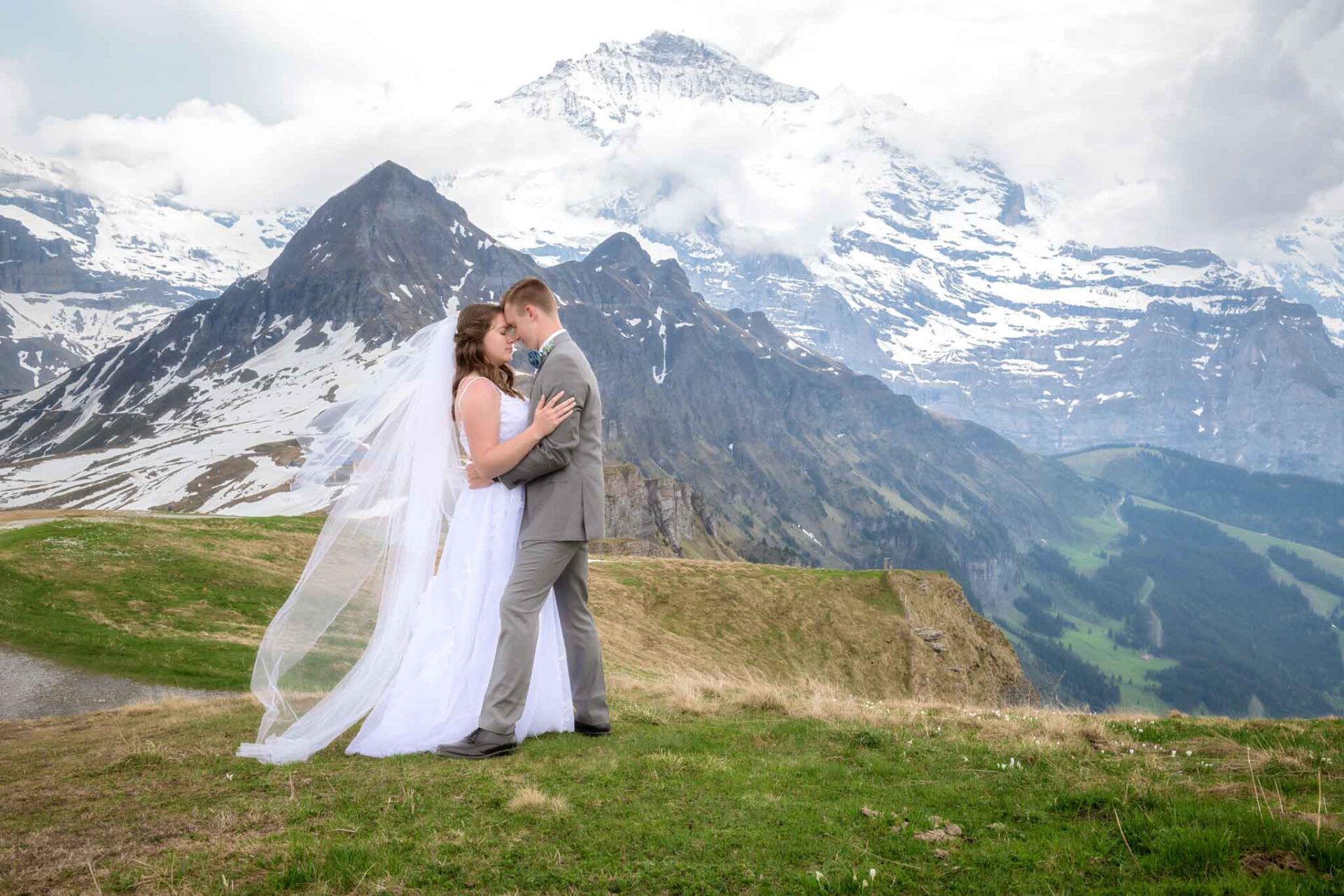 The Männlichen summit, easily reached by cable car from the Swiss alpine resorts of Grindelwald and Wengen, sits at 2,343 meters and offers breathtaking views — including the iconic north face of the Eiger. Even with the moody weather, or perhaps because of it, the setting was absolutely magical and perfect for unforgettable wedding portraits.